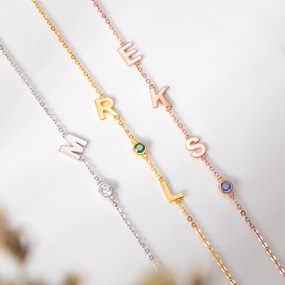 Zierliches Briefarmband zum Aufhellen der Handgelenke! Die Kette verbindet bis zu 6 Initialen und 1 Geburtsstein, die alle für Ihre individuellen Bedürfnisse angefertigt wurden. Der Name des Trägers wäre eine schöne Idee, um ein Geschenk für sich selbst oder Freunde zu machen. Beachten Sie, dass der Geburtsstein standardmäßig in die Mitte der Initialen gesetzt wird, wenn die ausgewählte Anzahl der Initialen zwei beträgt.